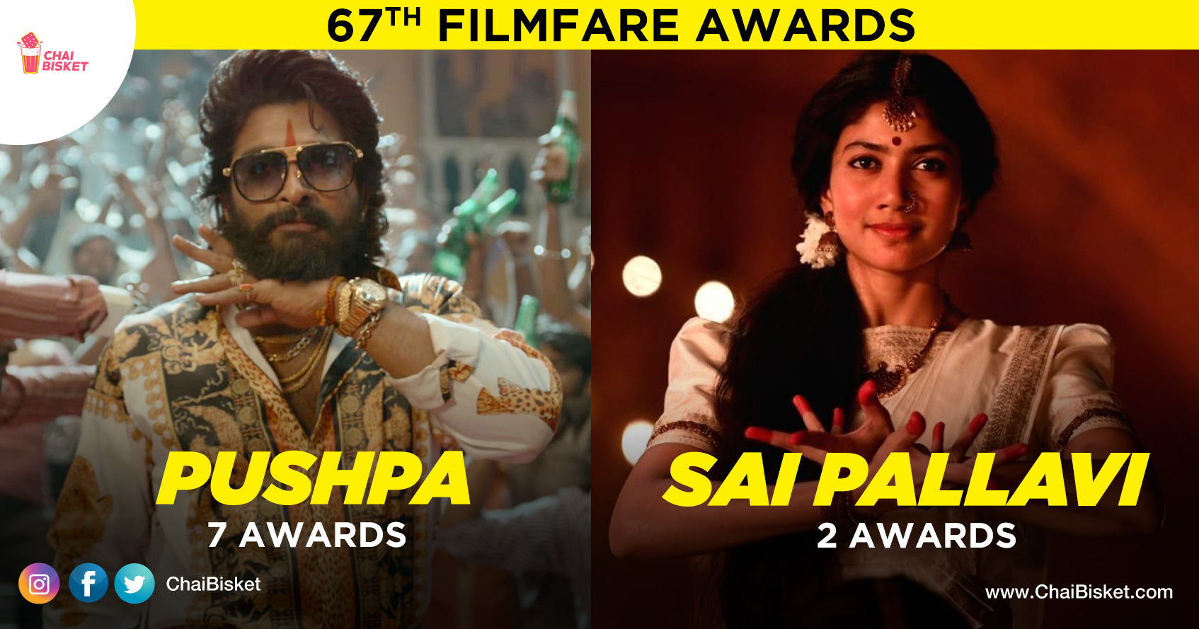 67 years history unna filmfare awards, ee saari, South India regional films ki 2020 and 2021 years ki combined ga awards ni announce chesindi. Major crafts lo awards ni win ayyi, Pushpa once again said 'Taggedhile'. Best Actress and Best actress critics rendu ee saari Sai pallavi ke vacchayi. Here is the complete list.