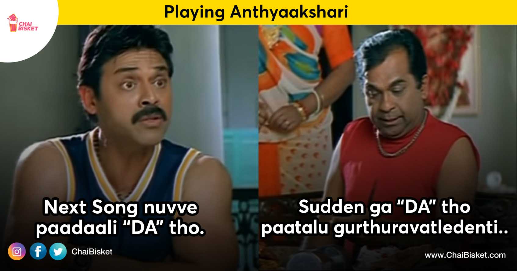 90’s kids ki chinnapudu best memories enti ante current poyinapudu adukunna games hide and seek kani, nela banda, muttinchukune aata inka enno.. Family antha kalisi kurchunte matram mind loki oche first game Anthaksari eh, “anthakshari aa du kun da ma , pa ta lu paa du kun da ma , ma nuve start chey ane dialogue iconic asala , by chance last line adhe rhythm tho meere padi unte , welcome to the royal club of anthaskhari. Paatal knowledge base evaridi gattiga unte vallu most valuable player mari, Ipl lo konnatu kotlalo konnukokapoyina, oka icecream o oka biscuit packet aasha petti lageskuntam, intha chesina motham batch evaro okaru paga pattesi ela anna pakka team ni padukopettedam ani fix aythar , daniki rende darulu okati tick tick 1 tick 2 two ani letter ichina 1 min lo start chesesi concentration debba tistharu. No 2 the legendary DA’/ డ letter ni dimputharu, DA’/ డ end aye songs istharu , oka 5-6 songs varaku manage cheseyachu a tharavathe osthadi pedha chikku, D for Devudu kadhu, D for Damaal ani, mari inka cover cheyaleka ekada leni vikrutha DA’/ డ patal anni tiskostham, I still remember singing some Diana white diana white ani, intha thala noppi enduku manaki ani we got a super pocket list of 20 songs that start with DA’/ డ, so before you play anthakshari in future in article ni save cheskondi , nakoka thanks cheppukondi.
