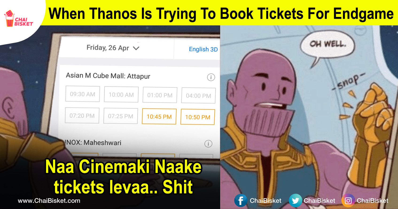 Ippudu ekkada chusina okkate word "Avengers Endgame". Thanos Thatha chitikesthe entha sepatlo bhoomi lo sagam mandhi poyaaro telidu kaani.., Endgame tickets vachinatte vachi aypothunnayi. IN JUST A SNAP.., What is this thatha ani Thanos ni adugudaamante 26 varaku saami raadu. Kaani ee lopu mana excitement, Ticket kosam mana Prayatnam aithe aagadhu kadha!.Maname kaadhu Whole World Avengers Endgame kosam wait chestondi. Aa waiting and excitement memes roopam lo ;)