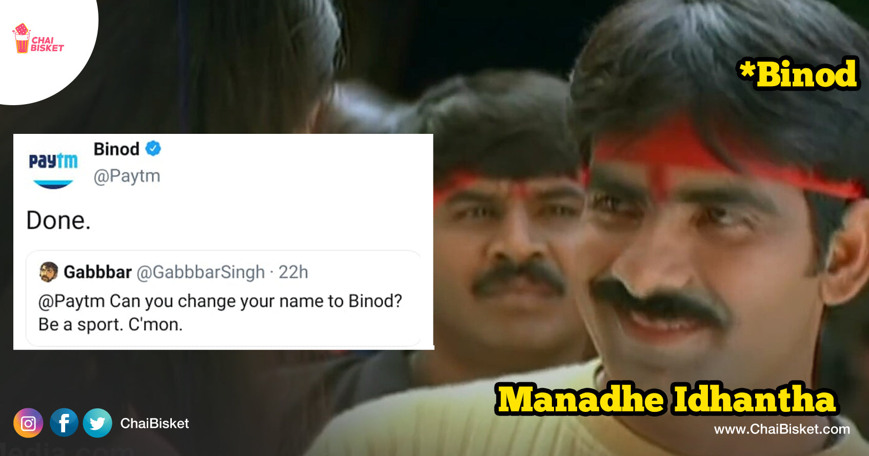Ika Paytm kuda oka Twitter handle request meedha, Tana Name ni "Binod" gaa marcheskovadam, Binod speed maamulugaa peragaledhu..