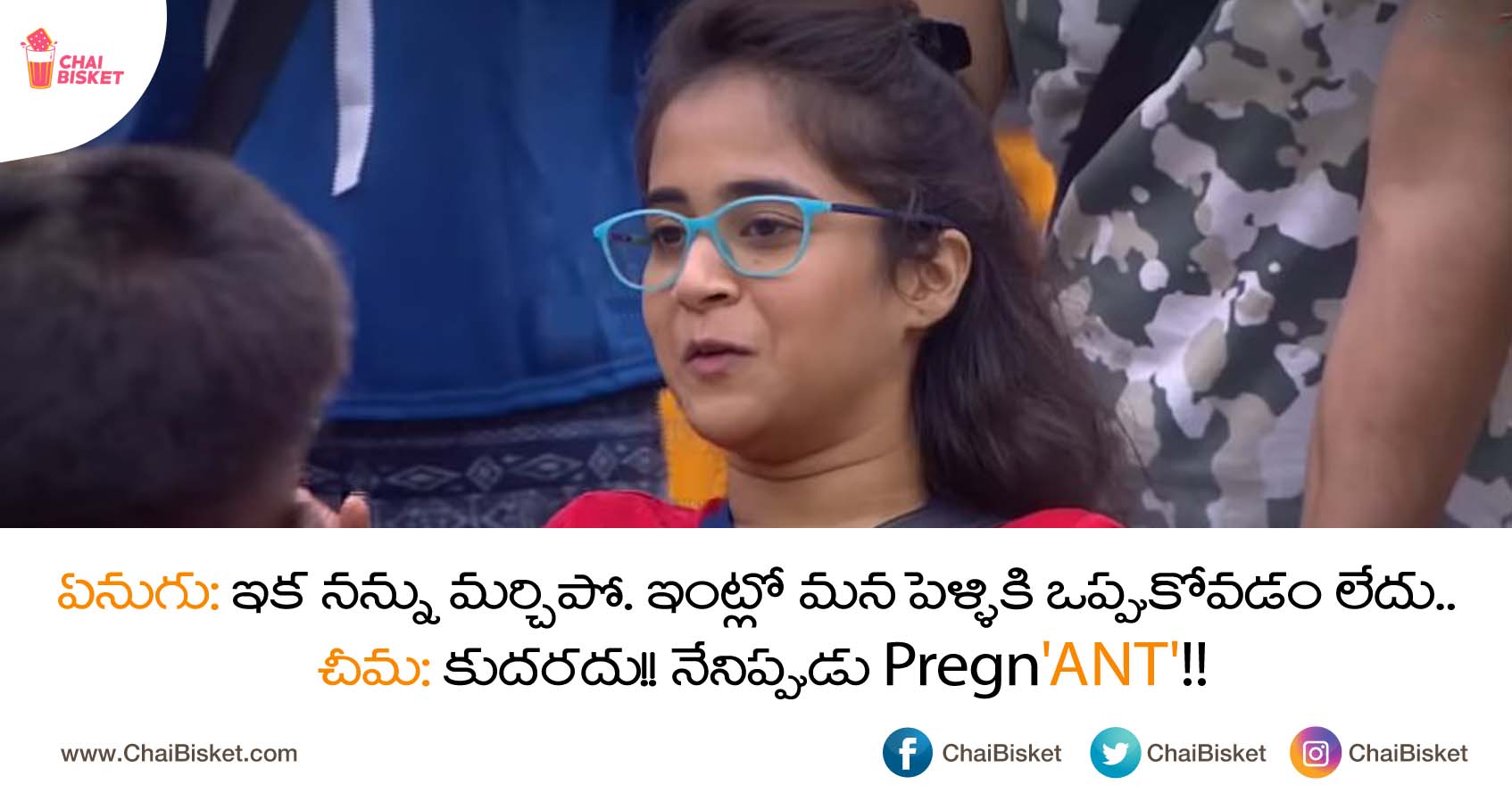ఏనుగు: I Love You.. చీమ: ఛీ!! సిగ్గులేదా.. ఇంకా ఎన్నిసార్లు చెప్పాలి నీకు.. "మా ఇంట్లో "Inter Size" మ్యారేజేస్ కు అస్సలు ఒప్పుకోరు.. దయచేసి నన్ను మర్చిపో".