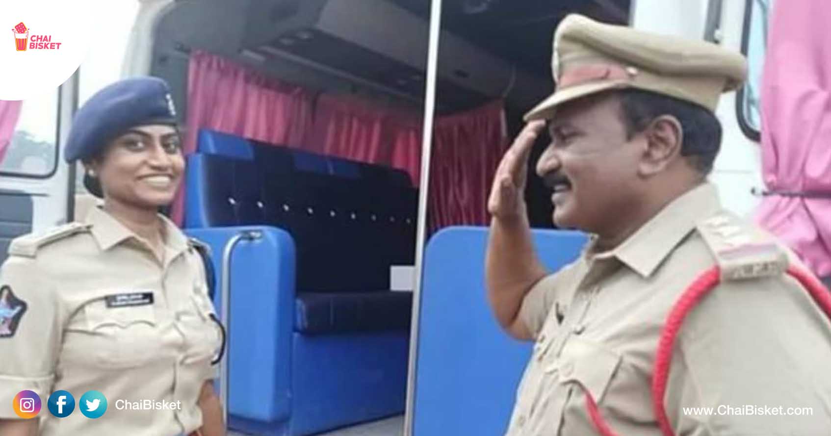 The father is CI (Circle Inspector) Shyam Sundar from Tirupathi and the one he is saluting is his own daughter, Y Jessi Prasanti.