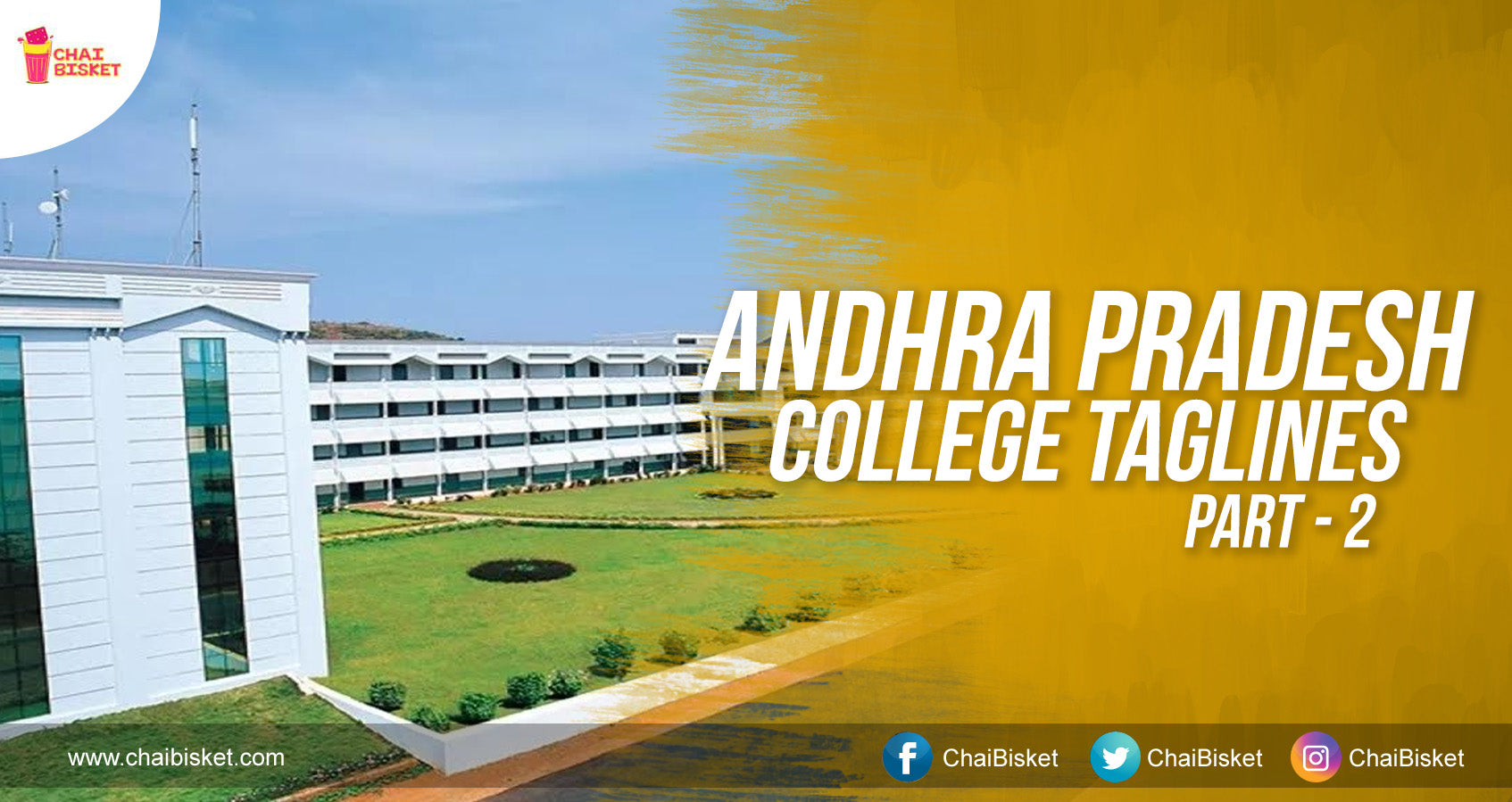 Taglines - A catchphrase or slogan that describes something in a way that is more simply and easily understood. Given an opportunity, anything in this universe can be given a suitable tagline. For us, we are more used to movie taglines. Idiot - Oh chanti gaadi prema katha, Baladoor - Veediki Baadhyathalu Ekkuva, S/O Satyamurthi - Viluvale Aasthi, Agnyathavaasi - The Prince in Exile.. ila cheppukunte pothe.. chalane unnai.. Ila regular taglines kakunda, kastha quirky ga.. honest ga ..colleges ki taglines isthe? After PART 1, we bring you the PART 2 of honest taglines for few more colleges of Andhra Pradesh. Look eskondi..