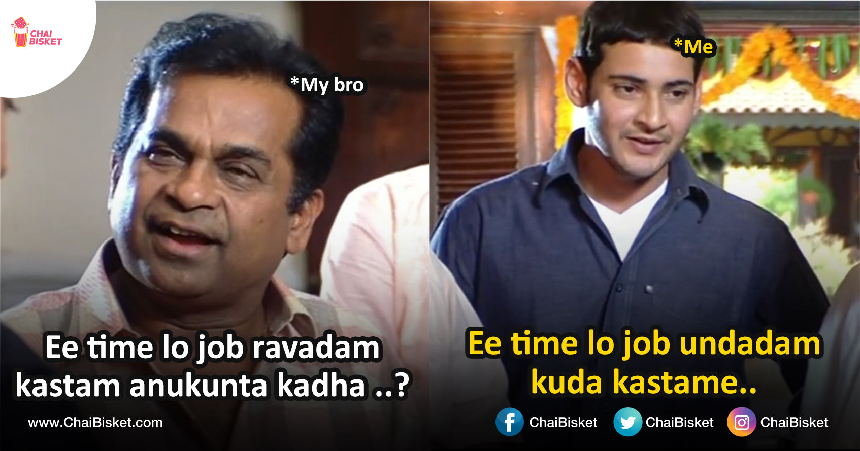 Me: Anna, ee time lo job ravalante luck undali kadha..? My bro: Ee time lo job pokunda undali ante kuda luck undali raa...