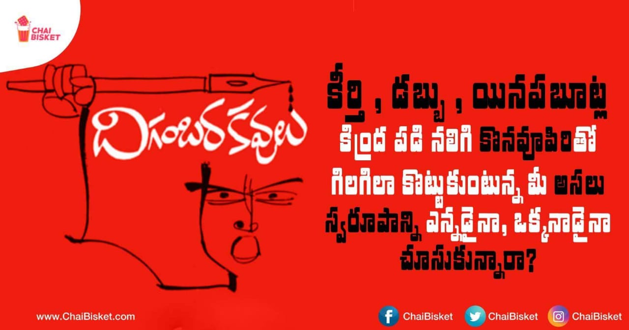 4. డియర్ స్కౌండ్రల్.. నువ్వు ఎప్పుడు ఏడ్వలేదని? ఎప్పుడో ఒకడు తంతాడని, ప్యాకెట్ కొట్టేస్తాడని, పరీక్ష పోతుందని, వ్యాపారం నల్ల సముద్రం పాలవుతుందని, నీ భార్యను ఎవడో లేవదీసుకెళతాడని ఎప్పుడూ ఏడుస్తూనే ఉంటావు. మరి ఎడ్వంది ఎప్పుడు? ఏడుపు మారుద్దామని వొళ్ళు మరిచేలా త్రాగినా ఏడుస్తూనే ప్రేలుతావ్. జేబులు నిండుకొన్నాక మళ్ళి ఏడుస్తావ్. నీవు చేసిన వెధవ పనికి, చేస్తున్న ముదనష్టపు చేష్టలకి రేపు పత్రికల్లో డొక్కచించి డోలు కడ్తారని ఒకటే ఏడుపు. మరి ఎందుకిలా నిన్ను నరుక్కుంటున్నావ్? జానెడు పొట్టకు కూడు దొరకాలేదనా? నగ్నత్వాన్ని కప్పివేయడానికి మారేడు బట్ట లేదనా. దౌర్భాగ్యపు వేషాలు.. అధికారాన్ని ఔపోసన పట్టినవాడా ఎన్నడయిన గుడిసె గడపముందు ప్రశాంతంగా నిద్రించిన శవాన్ని చూశావా.? మనస్సు మమతల రాగాలలో ఒయాసిస్సు కన్నీళ్లతో నిండిందని తెలిసిందా.?