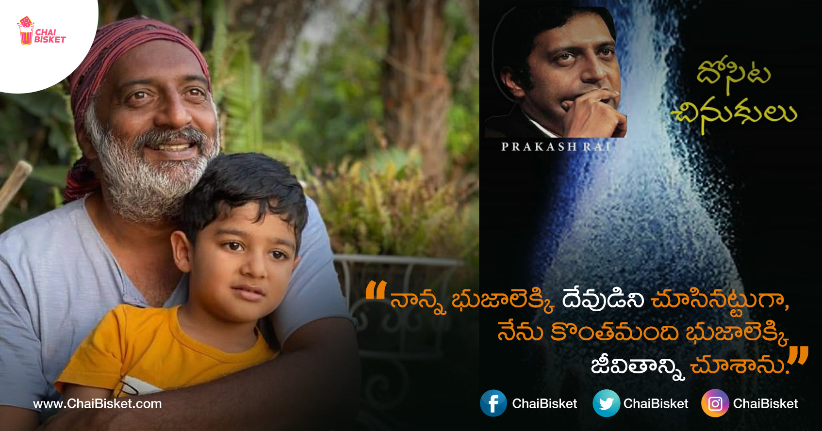ప్రకాష్ రాజ్ గారు పుస్తకం ద్వారా పంచుకున్న కొన్ని అనుభవాలు: 1. నేను నా తల్లిని అలా చూడకూడదు, చూడకూడదు: మిత్రుడొకడు కొత్త ఇల్లు కట్టించాడు. 'రావోయ్ వచ్చి చూడు' అంటే వెళ్ళాను. జబర్దస్త్ ఇల్లు, ఇంటిని చూస్తూ ఉంటే ఓ మూల గదిలో ఒకావిడ కనిపించారు. ఎవరని అడిగితే 'అమ్మ' అన్నాడు. మనసు బరువైంది. మా అమ్మ గుర్తొచ్చింది, నేను కూడా అమ్మ పట్ల ఇలా మారిపోతానేమో అని మనస్సుతో పదే పదే జగడానికి దిగింది. 'లేదురా నువ్వు బాగా చూసుకుంటావు' అనే జవాబు వచ్చేదాకా మనసులో అలజడి. అతడి తల్లిని చూసిన తర్వాత మిత్రుడి మీద గౌరవం పోయింది. ఉద్యోగం కోసం పిల్లలు విదేశాలకు రెక్కలు కట్టుకుని ఎగిరిపోతారు, కన్నవారి కోసం ఎంతో కొంత డబ్బు పంపిస్తారు. సంవత్సరానికొకసరి వచ్చి ఉండటానికి పెద్ద బంగాళా కడతారు. చివరికి దానిని చూసుకోవడానికి వాచ్ మెన్లలా పెట్టేది ఈ తల్లిదండ్రుల్నే. ఈ అపార్ట్మెంట్ జీవితం ఉందే.. ఇది మనుషుల్ని చూడక కేవలం గోడల్ని మాత్రమే చూసుకుంటూ సాగించే బ్రతుకు. దాన్ని చూస్తూ ముదిమి వయసువాళ్ళు తమ ఒంటరితనాన్ని గడుపుతారు. ఎక్కడో పుట్టి, ఎక్కడో పెరిగి, ఎక్కడో జీవించి అవసాన దశలో పిల్లలతో గడపాలి అని వచ్చి, ముక్కూమొహం తెలియని మనుషులతో, అర్ధం కాని ఊళ్లలో ఊపిరాడటమే కష్టమై, నవ్వుతూ మాట్లాడటానికి మనుషులే లేక బాధపడుతున్నారు. మన పెద్దవారు వృద్ద్యప్యాన్ని పొగడకపోవటం ఒక విషాదం. ఇలాంటి విషాదంలో ఒక రాష్ట్రం మునిగిపోయిందనటానికి ఇప్పుడు పెరుగుతున్న వృద్ధాశ్రమాలే సాక్ష్యం.