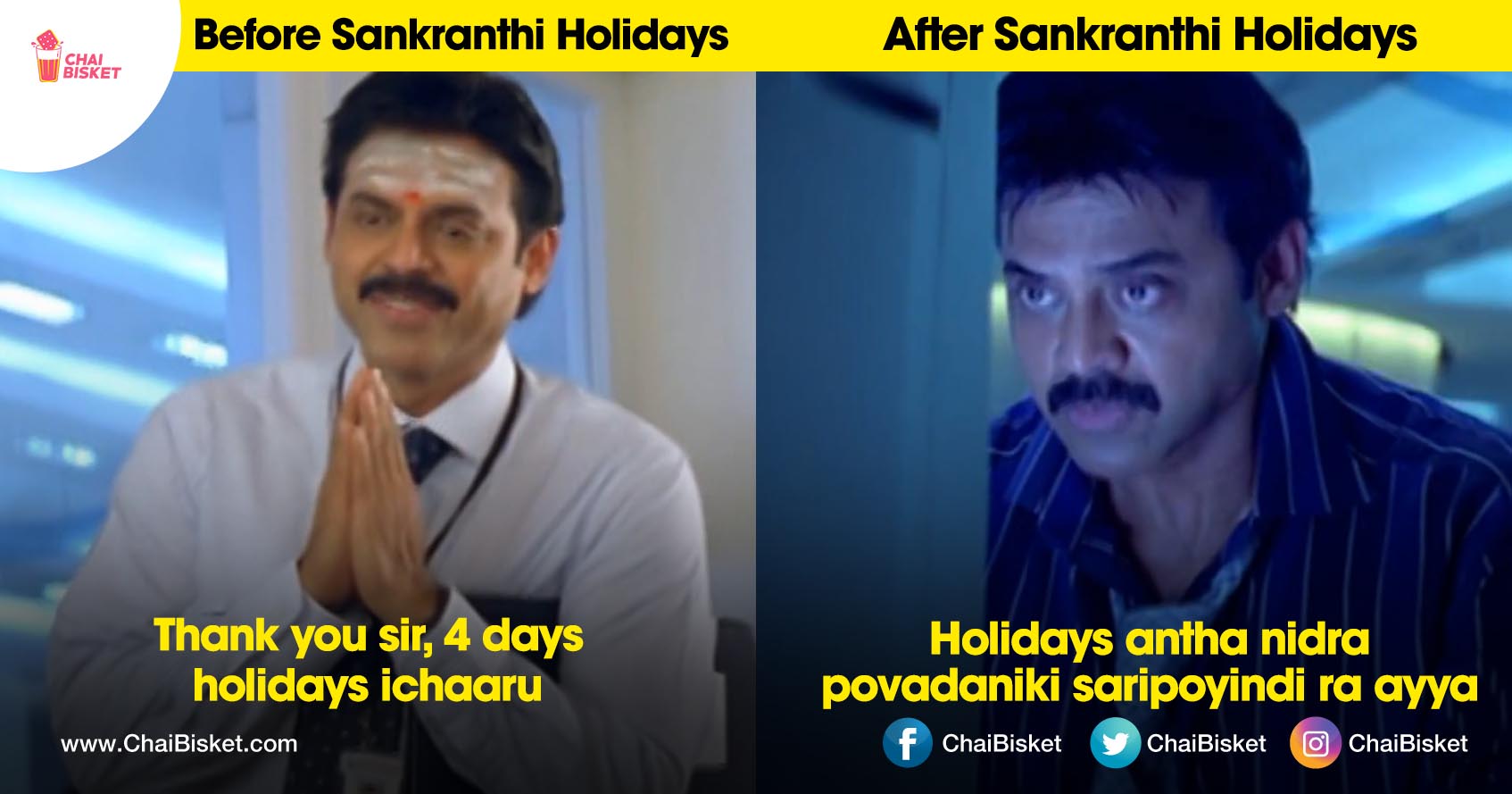 4. Asha jivuluu. Friday leave pettesthe weekends kuda kalisi vasthadi.. malli monday roje office mokam chusedhi, veelu andi asalaina sankranthi mogudu lu holidays ni timing lo use cheskoni manchiga enjoy chestharu.