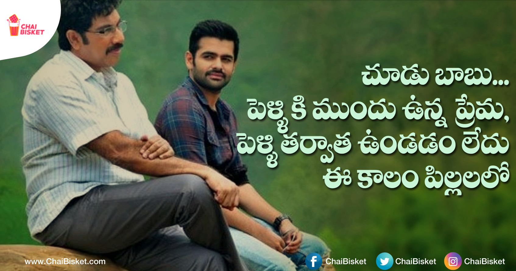 Srinivas uncle: Chudu Gowtham, daily chusthune unnam preminchinappudu unna prema kalisi brathiketappudu undatledhu ee kaalam pillaliki. Gowtham: Inter nunche love chesukuntunnam, pelli cheskuntam ane samaajam lo brathukuthunnam uncle, meeku doubt raavadam lo thappu ledhu. Vallandhari gurinchi naku theleedhu kani, nijanga preminche abbailu preminche mundhu okalaga pellina tarvatha okalaga untaaru ante nen nammanu uncle, endhukante meeku, Teju ki blood relation kabatti thanani intha baaga chusukunnaru kaani oka abbai oka ammai ni nijanga preminchadu ante.. mem em sampaadinchani rojullo kuda ma aakali champukuni valla aakali teerustham, ma avasaraalani vadhulukuni valla avasaralu theerustham, vallaki vontlo baalekapothe meelaga mem kuda thindi thippalu maanesi kurchuntam. Ante, maku puttaboye pillalni ela chusukovalo maku ippatinunde alavaatu aipoindhi anamaata.