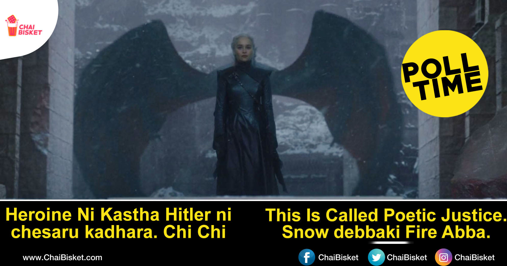 Yep, the most awaited GOT finale..the most unexpected way lo eeroju END aipoyindhi. I mean.. one of the greatest TV Series ever END aipoyindhi, kaani last season chusi ee series Hardcore fans nunchi mixed reactions vasthunnayi. Konthamandhi aithe ekamga Season mottham re shoot cheyyamani petitions kuda vesesaru. Ee lolli antha pakkana pedithe, 10 years paatu manam full ga connect aipoyina characters ki justice jarigindha ledha annadhi thelusukovatam kosame ee poll. Mee opinion meeru opt chesukondi. Edhanna charchinchali ante commencts section loki vaccheyyandi... Lets GO... P.S: Thank you GOT. Thanks for everything.
