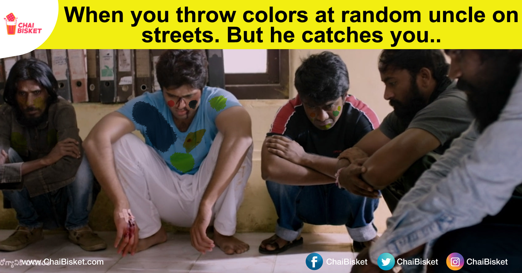 12. When you are playing Holi with an introvert/ lazy friend: 'Neetho Holi aadhithe ela untadhi thelsa ra? Naa rangu naa meedhe poskunattu untadhi'.