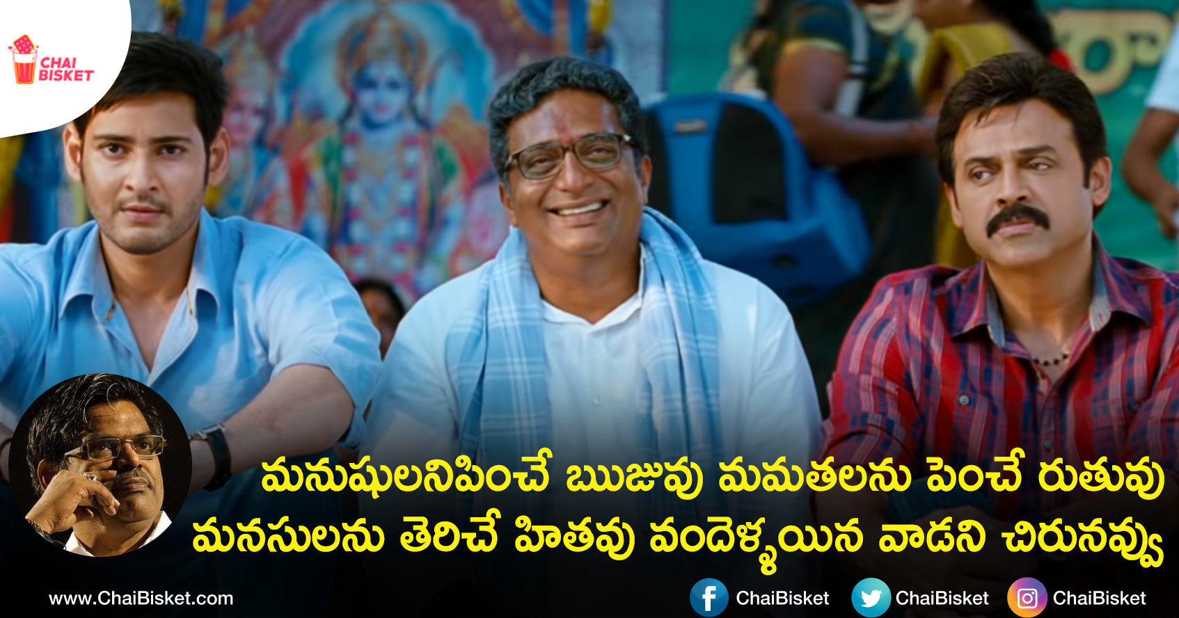 విశ్లేషణ:: మన పెదవి పైన చిరునవ్వు నవ్వాలి అంటే మనం ఏమి కసరత్తు చెయ్యక్కర్లేదు. సుఖశాంతులు కావాలి అంటే ఆ చిరునవ్వు ఒకటి మొహం మీద ఉంటె చాలు. మనం మనుషులని, మన మధ్య ఉన్నది మమతల కొలువని, మన మనసులని కలిపే వారధిని అసలు అంతం అంటూ ఎరుగని చిరునవ్వే కదా! (ఆ విషయం తెలుసుకున్న ప్రకాష్ రాజ్ గారి పాత్ర, అదే మన రేలంగి మావయ్య పాత్ర అందుకే ఎప్పుడు నవ్వుతూనే ఉంటుంది).