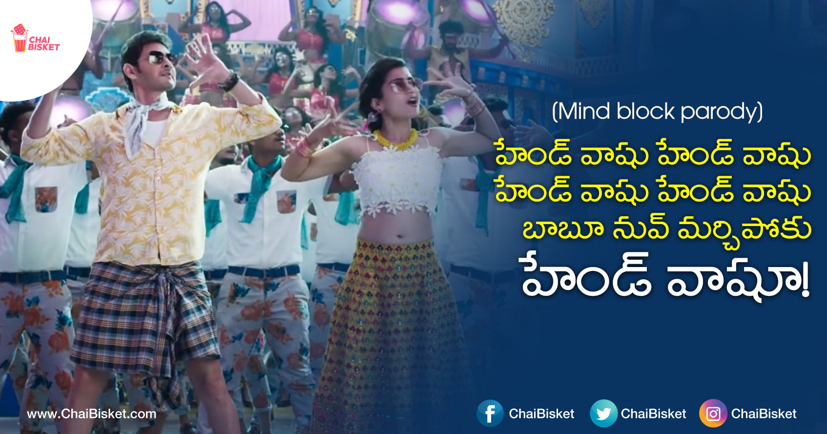 సరిలేరు నీకెవ్వరూ సినిమాలో మైండ్ బ్లాక్ పాటకు పేరడీ.... ******** ఎపుడూ రోడ్డెక్కేవాడూ ఇపుడూ ఇంట్లో ఉన్నాడు ఎపుడూ చెయ్యిచ్చేవాడూ ఇపుడూ దండం పెడతాడు మూతికేమొ మాస్కు కట్టి మాట గీట కట్టిపెట్టి స్టేహోము స్టే హోమని కూర్చున్నాడూ... ఫర్ ది ఫస్ట్ టైమ్ ఆల్వేస్ ఇన్ ద హోమ్ బాబూ నువ్ సెప్పూ ఏంటీ? ఆణ్ణి కడగమని హేండు నువ్ కడగరా కలవమాకూ కలవమాకూ బాబూ నువ్వెవర్నీ కలవమాకు తిరగమాకూ తిరగమాకూ అయ్యా నువ్ రోడ్డుమీద తిరగమాకు అదో ప్రాణాలు తీసె కొత్త బాకు..బాకు దేశదేశాలూ పాకుతున్న స్నేకు..స్నేకు దాని లక్షణాలు విన్నవంటె షాకు..షాకు అమ్మో..అయ్యో..అవునా..బాబో! మాట లెక్కచెయ్యకుంటె నీకు రిస్కు..రిస్కు ఫ్యూచరంటు ఉంటె చెప్పు నీకు రేపు...రేపు చెప్పినట్టు వింటె బతుకుతావు బాసు..బాసు అవునా..అట్నా..సర్లే..చెప్పూ! హేండ్ వాషు హేండ్ వాషు హేండ్ వాషు హేండ్ వాషు బాబూ నువ్ మర్చిపోకు హేండ్ వాషూ! ||హేండ్ వాషు||