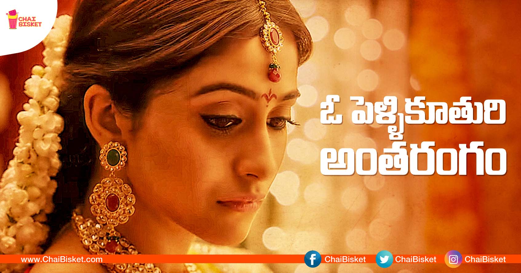 సమయం రాత్రి 10.30 అయ్యింది,పెళ్లి కూతురి అలంకరణలో నా రూమ్ పక్కన ఉన్నబాల్కనీలో నిలబడి ఆకాశం వైపు చూస్తూ నిల్చున్నాను, ఇల్లంతా హడావిడిగా ఉన్నా నా చుట్టూ మాత్రం నిశ్శబ్దం ఆవరించుకొని ఉంది, ఇంట్లో చాలామంది బంధువులు ఉన్నా, నేనెందుకో ఒంటరిగా ఉన్నాననిపిస్తుంది, ఇప్పటికి నా రూమ్ మొత్తం ఒక పదిసార్లు కలియతిరిగాను, నాన్న చిన్నప్పటినుండి నా పుట్టినరోజుకి తన చేత్తో రాసిన గ్రీటింగ్ కార్డ్స్ అన్నీ నాలుగైదు సార్లు చదివేసాను, నా రూమ్ లో, నా ఇంట్లో లో నాకు ఇదే ఆఖరి రోజు………… రేపటితో నా జీవితం పూర్తిగా మారిబోతుంది, నా పేరుతో సహా రేపు ఉదయం 11గంటలకి నా పెళ్లి....... గుండెల్లో గుబులు, మనసు లోతుల్లో ఎదో పోగొట్టుకున్నాననే భాధ, ఎందుకో తెలీని ఆందోళన, రేపటి నుండి ఎలా ఉండాలో అనే భయం, నా అనే వాళ్ళని వదిలి వెళ్తున్నాననే బెంగ, ఒళ్ళంతా చెమటలు, తెలీకుండానే కళ్ళలోంచి ఉబికివస్తున్న కన్నీరు ..... బహుశా ప్రతి అమ్మాయికి ఈ పరిస్థితి ఎదురవుతుంది కావొచ్చు. పాతికేళ్ళ నా జీవితం అంతా ఒక్క సారి నా కళ్ళముందు కదులుతుంది,ఎన్నో అందమైన అనుభూతులు,అనుభవాలు,అన్నీ ఇక జ్ఞాపకాలు గా మిగిలిపోతాయి.