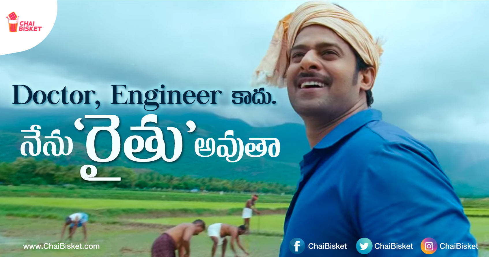 సుహాస్:- ఎహె ఎంటండి, ప్రతి ఓడు జాబ్ జాబ్ జాబ్ అంటారు ..ఏ వ్యవసాయం ఓ జాబ్ కదా?? ఓ పని కదా??.మీలాగే ప్రతీ రైతూ ఆలోచించి ఉంటే ఈ పాటికి మీరు గడ్డి తింటూ ఉండేవారు. జాబ్ ఉన్న వాడికి మీ కూతుర్ని ఇచ్చినంత మాత్రాన తినమని బంగారు బిస్కెట్ లేమి పెట్టడు వాడు పెట్టేది అన్నమే. మనం ఇప్పుడు ఇంత సంతోషంగా ఉన్నాము అంటే దానికి కారణం ఒక సోల్జేర్, అదే మనకి టైయనికి నలుగువేళ్ళు నోట్లోకి వెళ్తున్నాయి అంటే కారణం పంట పండిస్తున్న ప్రతి రైతు సోల్జేరే. ఈ గవర్నమెంట్ ఉందే.. మంచి పబ్ పెడతాను అన్నవోడికి మంచి బ్రాందీ తయారు చేస్తాను అన్నవోడి లోన్లు ఇస్తారు కానీ కొన్ని వేలమంది కడుపు నింపే రైతుకి మాత్రం లోన్లు ఇవ్వడానికి చేతులు రావు. కంకర రోడ్డు అయినా పర్వాలేదు అని మంచి మార్గం లో వెళ్లే మమ్మల్ని సిమెంట్ రోడ్ వేసి మరీ తప్పుడు మార్గం లో తీసుకు వెళ్లే వాళ్ళు ఉన్నంత కాలం దేశం బాగుపడదు.రైతు అవ్వనక్కర్లెద్దు, రైతుని గౌరవించండి చాలు జై కిసాన్
