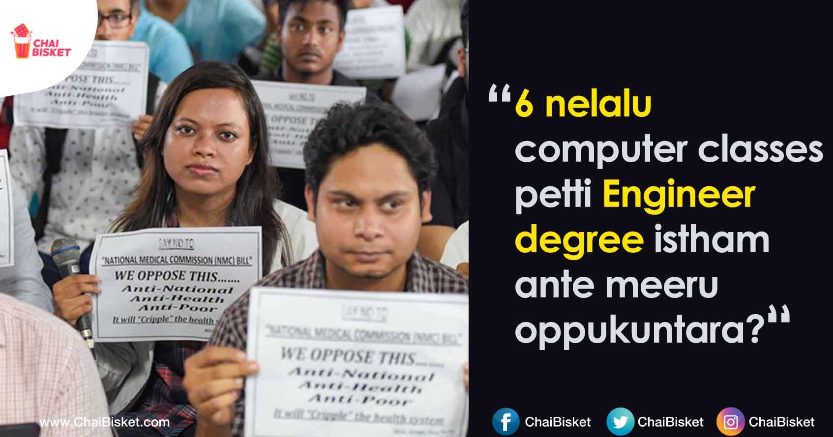 Inkokati yentante, 50% seats privatization. Repati rojuna me intlo nundi oka doctor avali ante, mee chethilo kotlu vundali leda, aa ammayi or abbayi extremely genius avvali. Yendhukante velampata laga seats ni ammukomani private college chethilo pedte yela avthundo meeku thelusu . Ayna sare! Ivanni mana daka vachinappudu kadha! Ha manollevaru doctor chadavatledu le! Ha manam Apollo lo chuyinchukundam le! Ha manam yem cheygalam le.. ani chusi chudanattu vellipoyevallaki oke oka prasna? humanity! yepudina idhi mee jevitham lo vinnamu ante daaniki ardham telsukodaniki prayatninchandi. Idi yevarini hurt cheyali ani petadam ledu. Chala mandhi ippatiki, roads medakocchi nuisance chesthunnaru ani senseless ga alochistunna vallaki, okkasari alochinchandi. Ma kosam kadu, Mana kosam. Mana bhaavi bhavisyattu kosam. Because, we are still in a democratic country !and we can do anything if we stand together. Ledhu, I can just ignore the white coats bleed ante, you are just waiting for the INDIA to bleed one day.