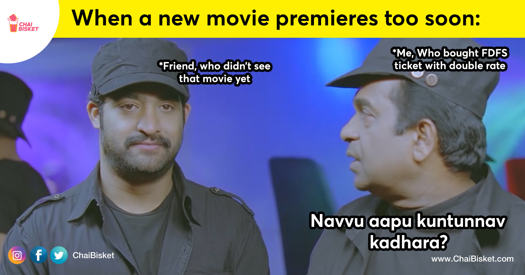 2. Okasaari chusi oorukokunda, repeat lu meedha repeat veyyadaaniki theatres chuttu tirige me be like: