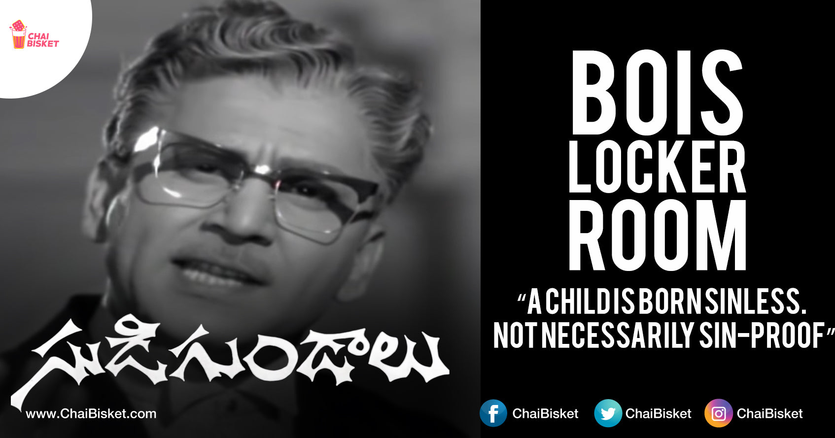 Sudigundaalu movie 1968 lo vachindhi. Wayyyyyyyy back. But it talks about a very very important issue. Ee cinemalo ANR gaari kodukuni oka teenage abbayi daarunanga champuthadu : inkoka teenager kosam. Hathya rujuvavuthundhi. Kaani Court Hall lo ANR ye vaari tharaphuna vaadhisthadu. Thana kodukuni champina padihenella yuvakudiki siksha padakunda vaadhisthadu!! Enduku?