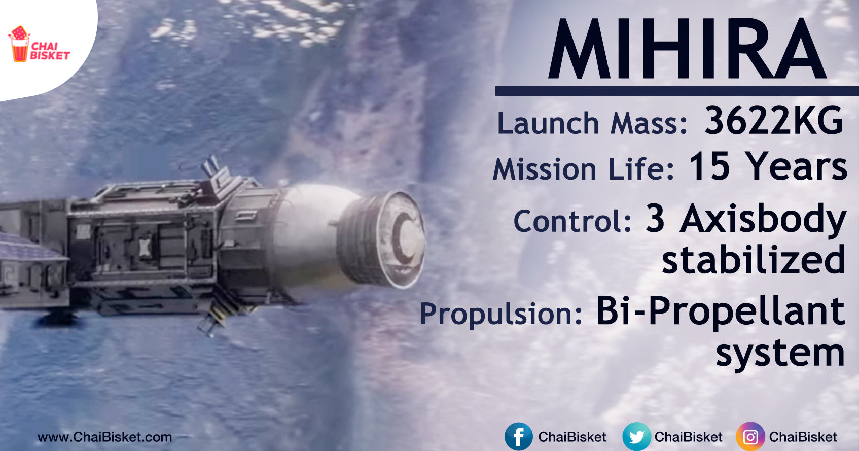 MIHIRA • Communications & Meteorological data relay satellite • Launch Mass: 3622KG • Orbit : Geo-stationary orbit - Geo-stationary Orbit: A geosynchronous orbit is a high Earth orbit that allows satellites to match Earth's rotation. Located at 22,236 miles (35,786 kilometers) above Earth's equator, this position is a valuable spot for monitoring weather, communications and surveillance. • Mission Life: 15yrs • Control: 3 Axis body stabilized To know more about three axis body stabilization CLICK HERE • Propulsion: Bi-Propellant system • Power: 6200 w from solar arrays, 2 Li-ion batteries (144 ah) • Payload: Ka/Ku-band and Q/V-band ( Antennas ). Geo-stationary High Resolution Camera