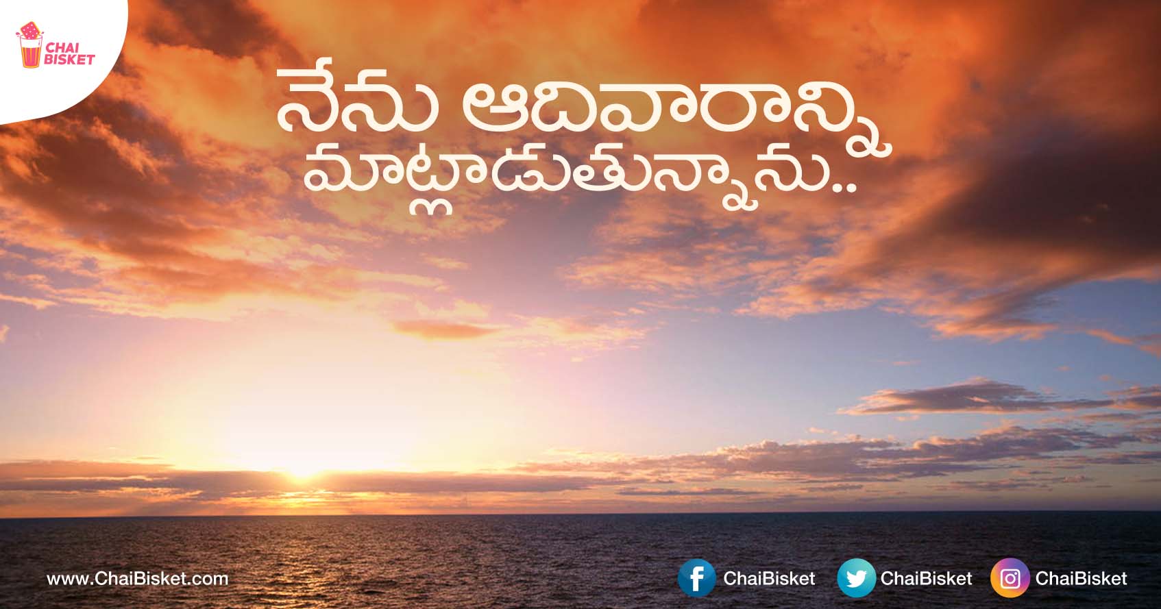 ఆదివారం అని పిలవబడే నన్ను అందరూ కేవలం క్యాలెండర్లో, ఒక డేట్ లా, వారంలో ఒక రోజులా చూస్తారే తప్ప, నా మనోభావాలను గుర్తించి, వాటికి విలువ ఇచ్చి గౌరవించరు. అయినా సరే నా బాధను దిగమింగి, అందరి జీవితాలలో ఆనందపు వెలుగులు నింపడానికి వస్తూనే ఉంటాను.