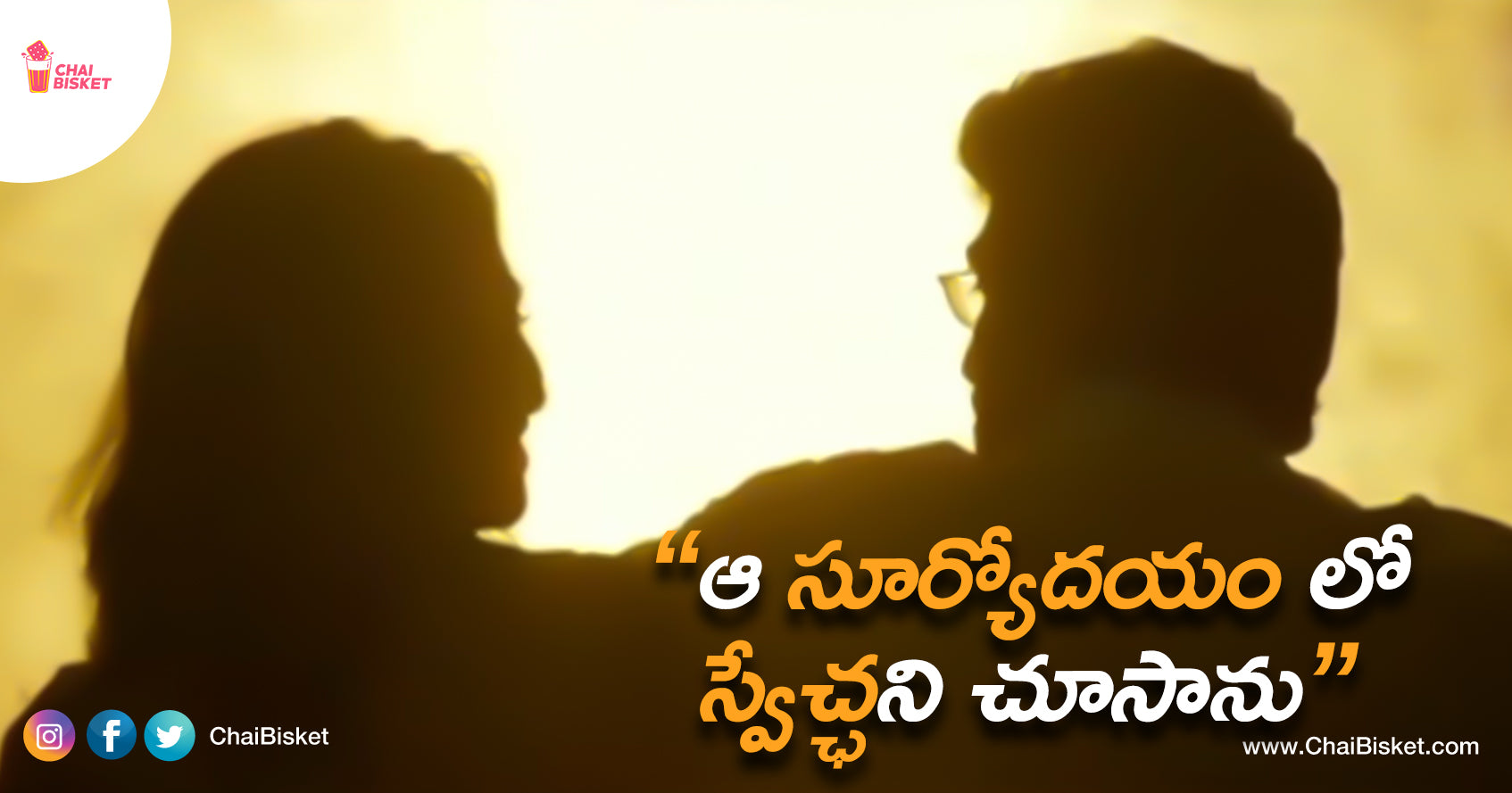 Swecha: Adhem ledhu, Same nee story ye kaani avi chesadu ani nenu preminchale, preminchanu kabatti a phase lo help chesadu emo anthe. Sunrise is bliss, peaceful and the best friend one can ever ask for. Okapudu kopam, baadha enno unsaid emotions undevi, evaritho cheppalo, evari medha chupinchalo ardam ayyedhi kadhu. Jeevitham loki sunrise ochaka unna chikati ni tisesi nannu velugu loki tosindhi. Aa tholi kiranale na chivari karanam leni kopalani champesayi. I'm forever grateful to sunrises. Chala mataldeskunnam kadha padha tea tagudham