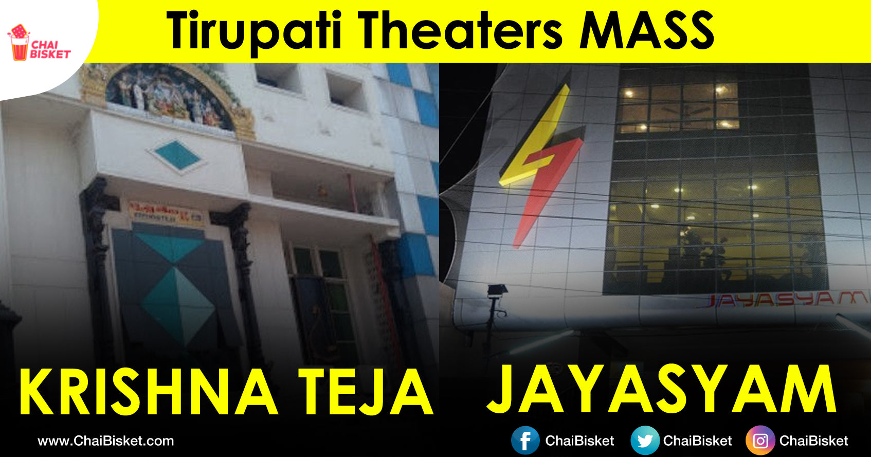 Tirupati ante Venkateswara Swamy Temple. Idi outsiders ki gurtochedi, Kaani naalanti locals ki maatram FDFS appudu kalakalalaade Movie theaters kuda gurtostaayi. Mass ki oka perfect example andi maa tirupati theaters. College chadive rojullo attendance ki entha importance isthaamo, FDFS roju movie chudataniki theater mundu attendance ki kuda anthe importance ichevaallam. Let me introduce my Tirupati theaters, on behalf of all my Tirupatians