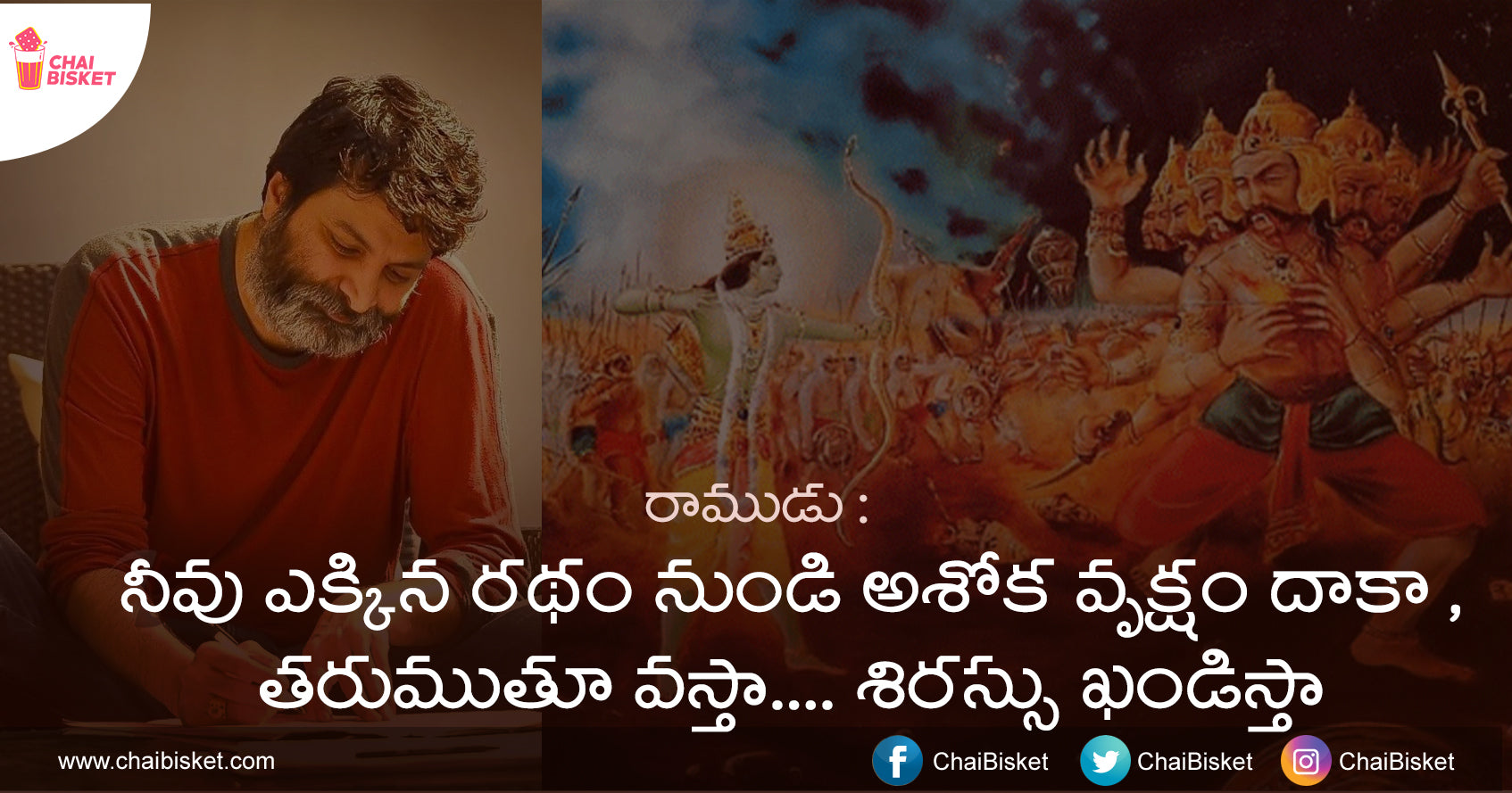 రామాయణం అంటే రామ రావణ సంగ్రామం మాత్రమే కాదు. నరుడిగా రాముడిచ్చిన స్ఫూర్తి, పట్టుదల, ధ్యేయం.... రామాయణాన్ని వెన్నంటే నడిపించే ధర్మం ఇంకా ఎన్నో ఎన్నెన్నో నేర్చుకోవలసిన, నేర్చుకోదగిన విషయాలు కోకొల్లలు. అటువంటి విలువలు జనాలకి అర్ధమయ్యే విధం గా బయట చెప్పేవారు లో చాగంటి గారు ఒకరైతే, ఈ మధ్య సినిమాల రూపం లో చెప్పే ఒకేఒక వ్యక్తి త్రివిక్రం శ్రీనివాస్. అయన సినిమాల్లోని అంతర్గతంగా ఉన్న మాటలు, సాహిత్యాలు గురించి ఎవరూ చెప్పనక్కర్లేదు. అటువంటిది, అయన సినిమాల్లో రాసిన డైలాగులు, రామాయణం కి అన్వయిస్తే ఎలా ఉంటుందో చూద్దాం.