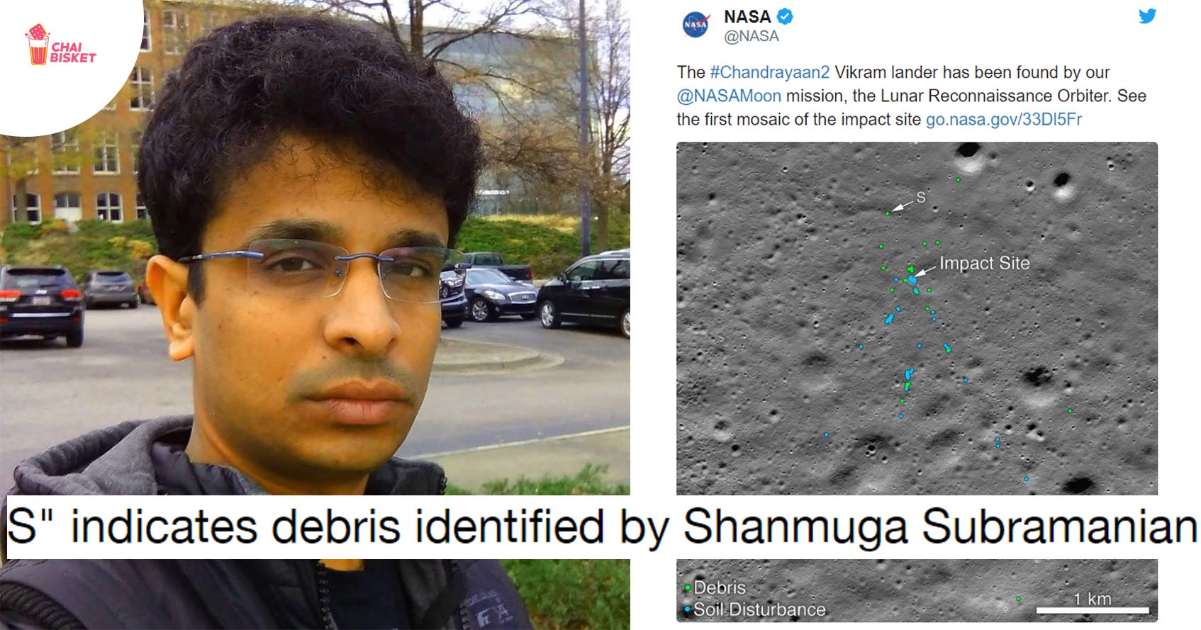 September 7, ISRO vallaki Vikram Lander ki unna communication cut ayyindi. Appatinundi ISRO, NASA ilaa enno space organisations Vikram Lander gurinchi search chesthune unnay. But NASA release chesina konni images help tho Chennai based techie and Mechanical Engineer "Shanmuga Subramanian (Shan)" Chandrayan 2,Vikram Lander ni identify chesaaru. Tanu identify chesina vishayalani NASA vallaki chaala rojula kritham mail chesaaru. NASA vaatini base cheskuni research chesi Vikram Lander location ni confirm chesindi. (Ee image lo 'S' stands for debris identified by Shanmuga Subramanian)